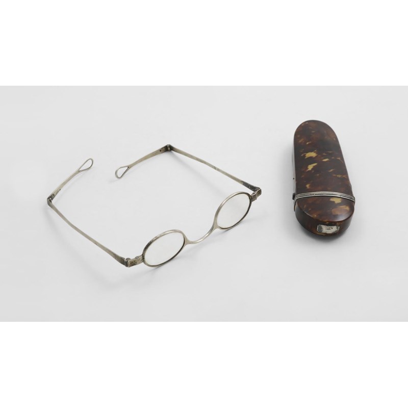 A PAIR OF GEORGE III SPECTACLES with double-hinged arms, by Samuel Pemberton, Birmingham 1812 contained in a mounted tortoiseshell case; the latter 5" (12.6 cms) long