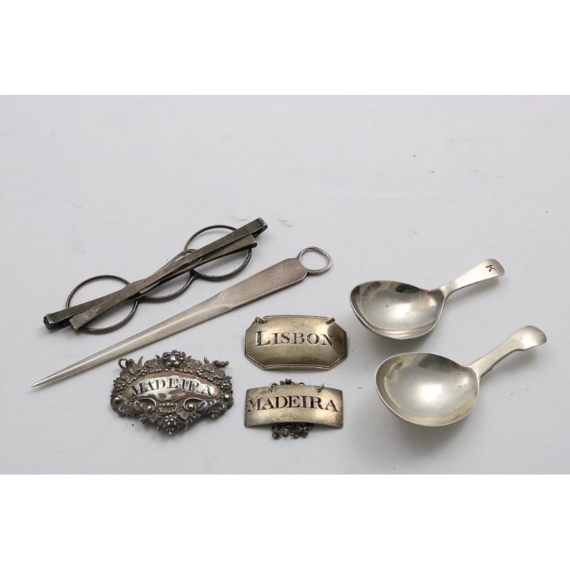 With folding silver frames early 19thC, a skewer Sheffield 1915, three wine labels (Lisbon by Peter, Anne & William Bateman 1801, Madeira c.1800 and Madeira 1824) and two caddy spoons (1822 and Sheffield 1936) (7)