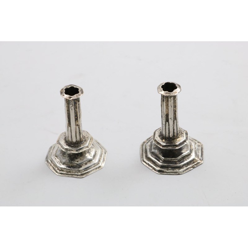 A PAIR OF QUEEN ANNE MINIATURE OR TOY CANDLESTICKS on stepped octagonal bases with fluted columns and octagonal drip ledges, maker's mark indistinct, London 1709; 2.4" (6 cms) high; 0.95 oz (2)