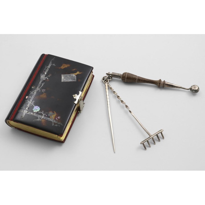 A LATE 19TH CENTURY ITALIAN TORTOISESHELL-MOUNTED BOOK "LAVIA DEL PARADISO.... dei DIVOTI CRISTIANI" (printed MILANO 1885), with an inlaid cover, together with three linked tools from a snuff mull; rake, spike and sifter spoon with turned wooden handle, unmarked, early 19th century; the book 4.3" (11 cms) long (2)