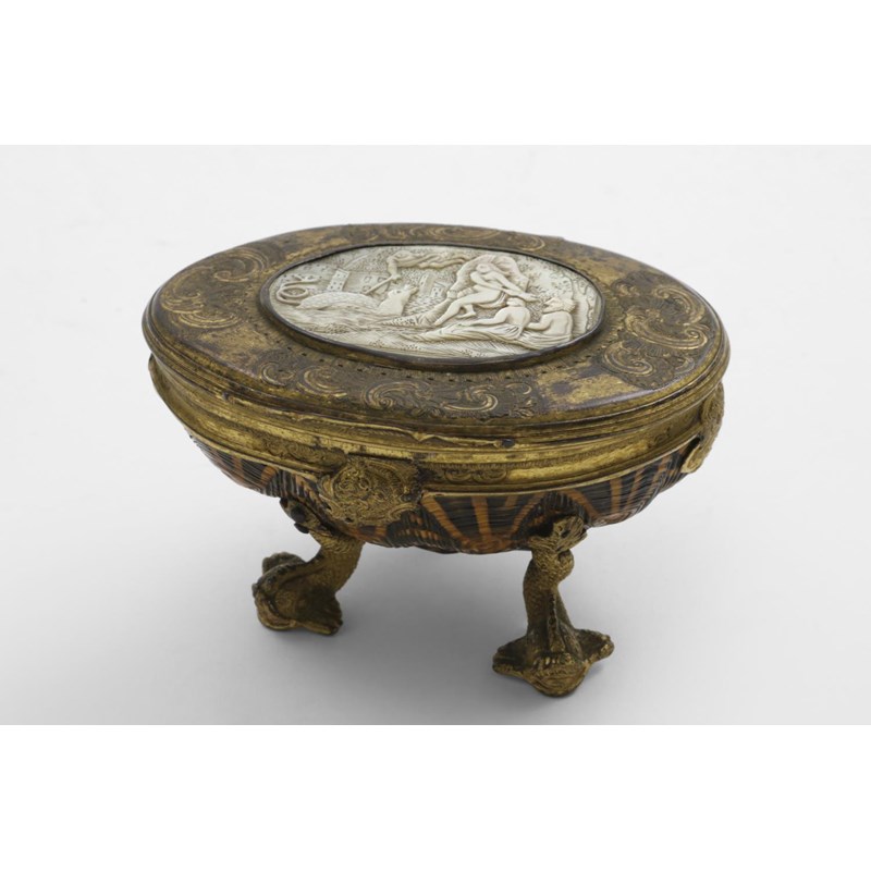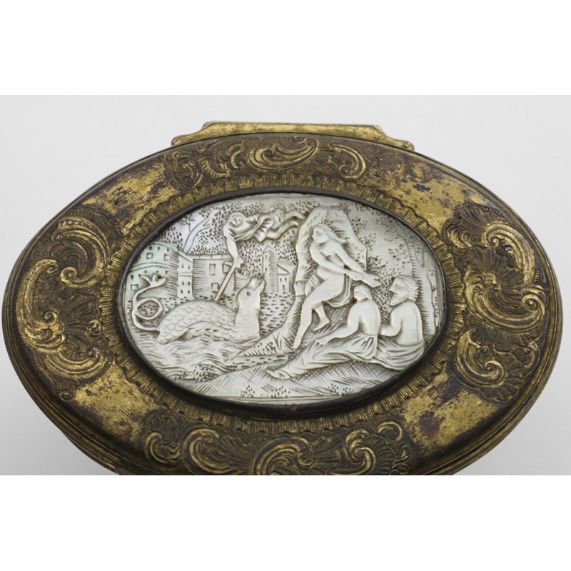 on three dolphin supports with an applied, chased mask below the thumbpiece, the hinged cover inset with a carved mother of pearl plaque, bordered by vignettes of flat-chased scrollwork & shells, unmarked, 1745-60; 5" (12.6 cms) long