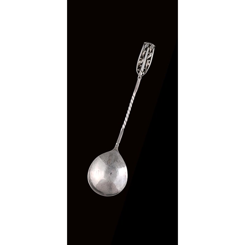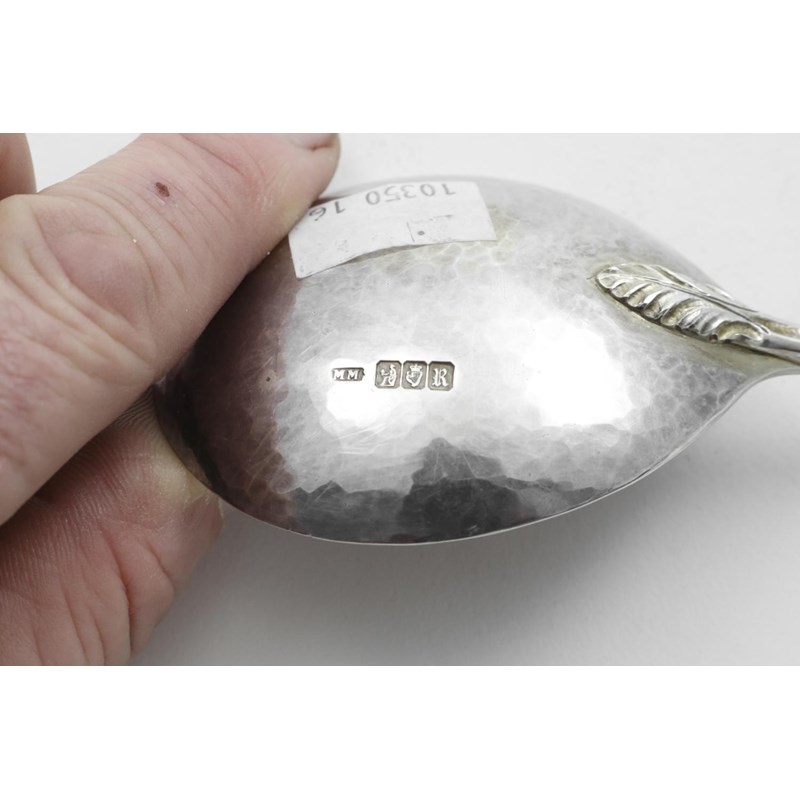 with a hammered, near circular bowl, a chased leaf rattail and a part-twist stem, the terminal laced with laurel leaves and berries and cabachon-set with a navette-shaped, garnet boss within a corded wire border, by Mary Montgomery (of Fivemiletown, Co Tyrone), hallmarked Dublin 1912; 9.7 (24.5cm) long; 3.4oz