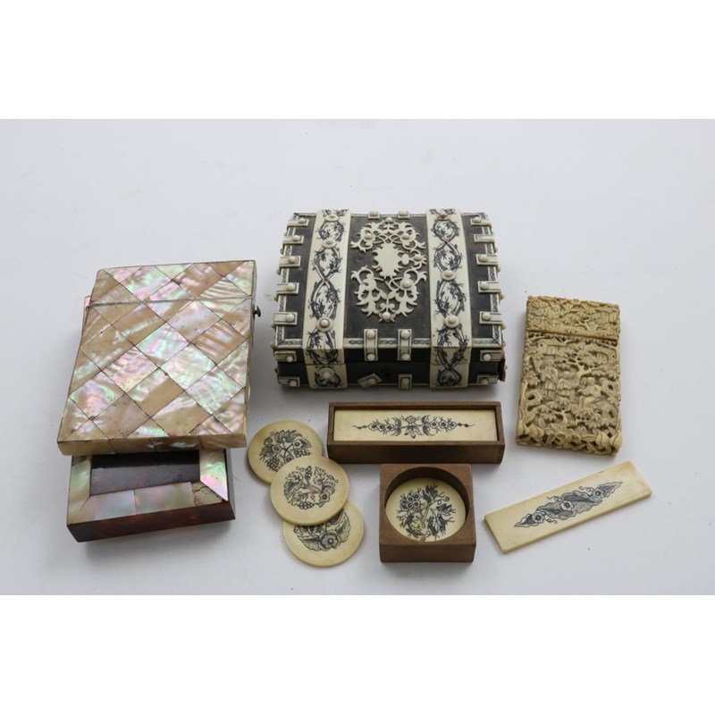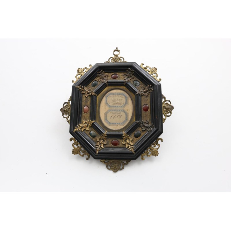 AN ITALIAN FRAME In 16th century style, octagonal ebonised & gilt brass set with hardstone cabachons, 19thC. together with an Indian horn and ivory box and three various card cases.