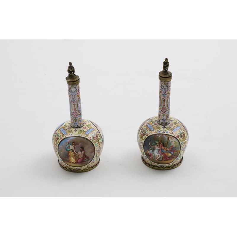 A PAIR OF ENAMEL FLASKS AND STOPPERS of bottle shape, the bodies each with three reserved medallions, probably Viennese, late 19th century; 11 cms high