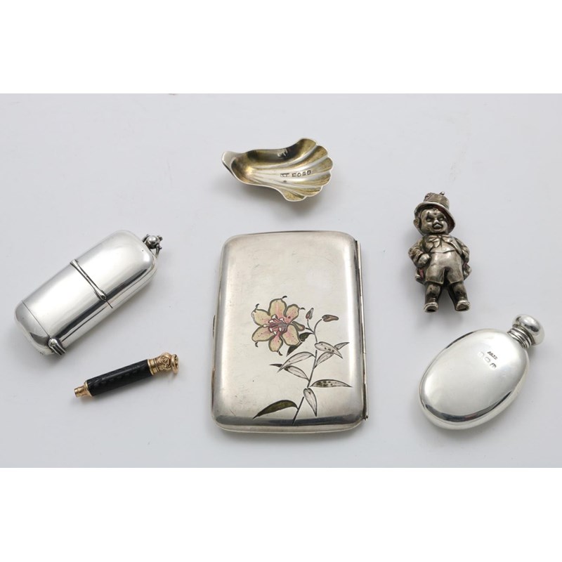 A combined vesta and sovereign case, initialled by Minshull and Latimer, Birmingham 1901, a small oval scent flask, a Japanese cigarette case, a small gilt-metal pencil, a caddy spoon bowl and a small rattle in the form of a boy; the latter 2.25"; 5.7 cms) long; 4.7 oz (6)