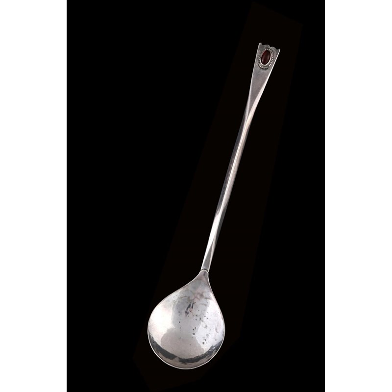 with a drop-shaped bowl and a carved faceted stem, fluted on the back of the bowl, flattened and shaped at the terminal and Cabachon-set with a garnet boss within a bead border, by Mary Montgomery (of Fivemiletown, Co Tyrone) hallmarked Dublin 1914; 8.2" (20.8cm) long; 2oz