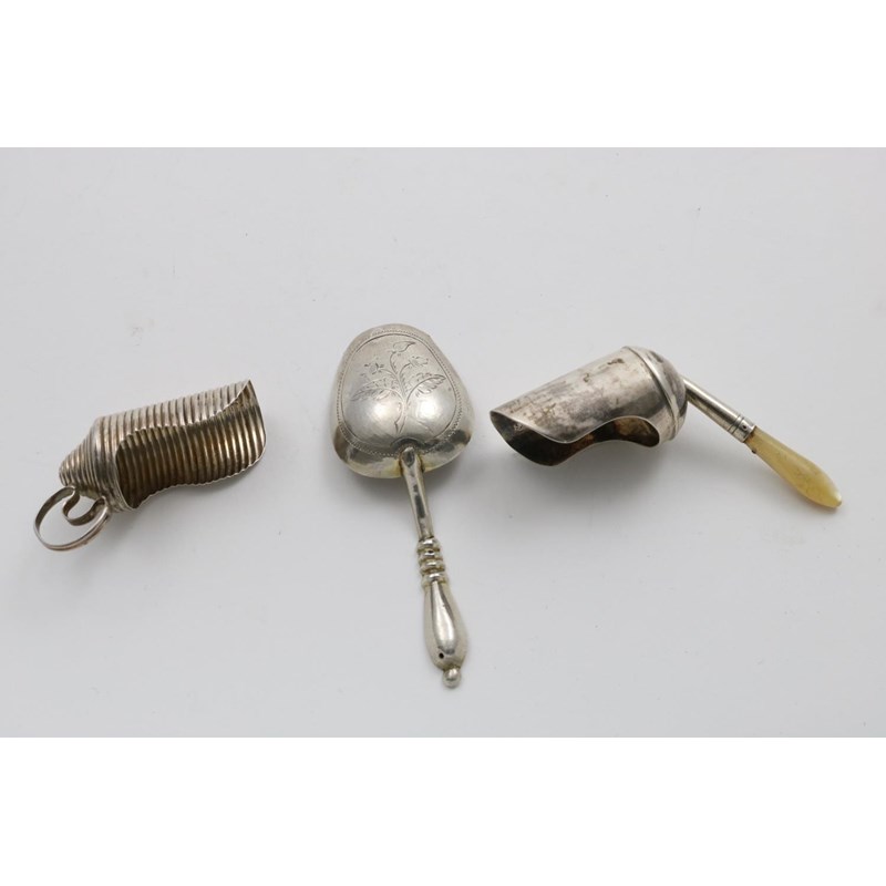 A George III ribbed example with a shaped ring handle, no maker's mark, Birmingham 1802, another with a mother of pearl handle, by Joseph Wilmore, Birmingham 1809 and a Russian example, engraved on the back of the bowl with a flower by Ivan Murahkin of Kostroma 1896-1908; the latter 3.4"  (8.5 cms) long;  0.75 oz  (3)