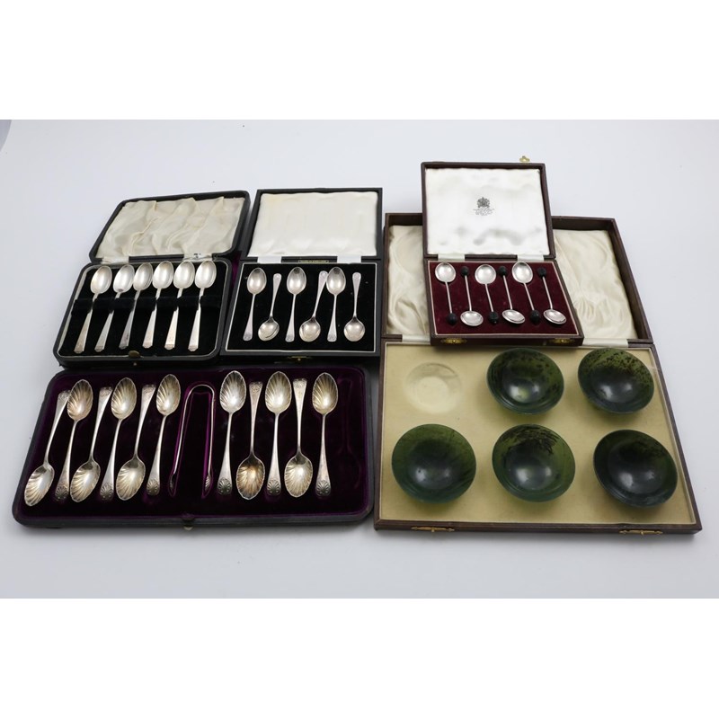 A set of six Art Deco tea spoons, initialled, two sets of six coffee spoons, a set of eleven plated tea spoons and a pair of plated sugar tongs with shell terminals, and a set of five small nephrite dishes; the latter 2.75" (7 cms) diameter; 4.8 oz weighable silver (5)