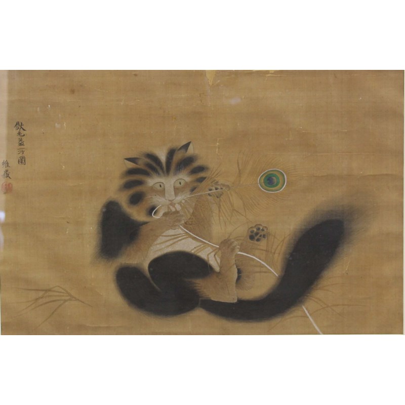 Black and white cat playing with a peacock feather, watercolour on silk, signed I-Gaku, red seal mark, framed, 35cm x 52cm