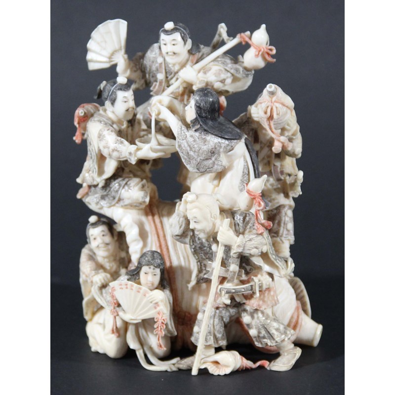 JAPANESE IVORY OKIMONO, Meiji, carved as climbing on a giant shell, some black and red colouring, signature to an oval cartouche, housed under a glass dome height 11cm
