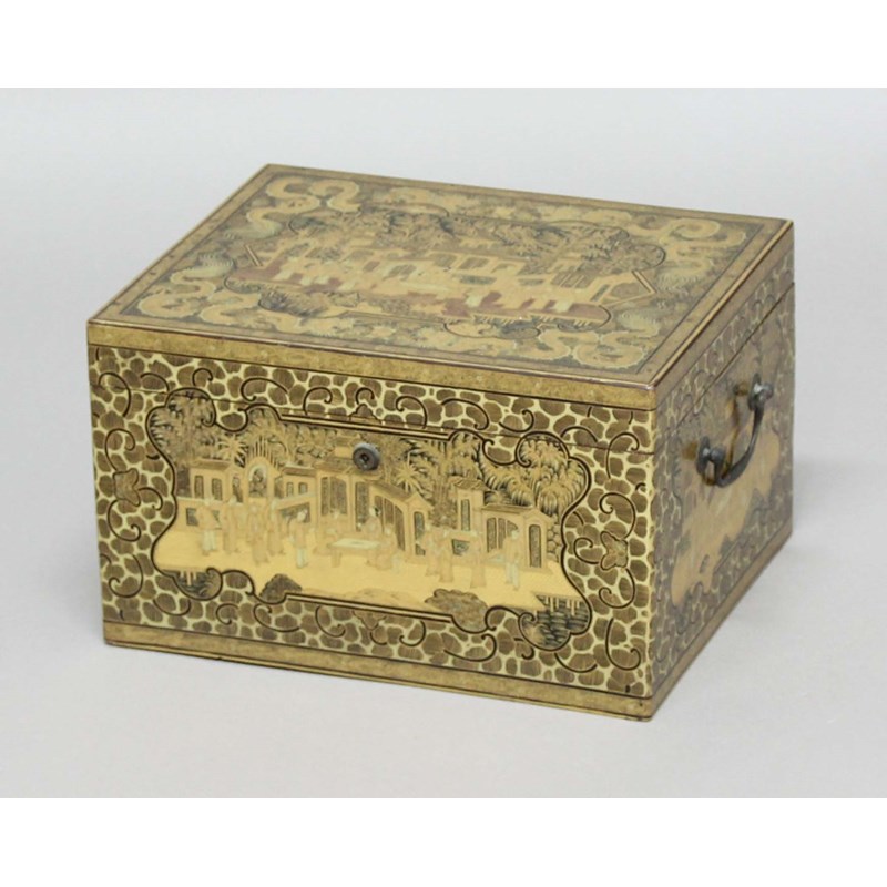 possibly late 19th century, decorated to each panel with figures before pagodas in scrolling cartouches and surrounded by dragons, with a pewter lidded liner with chased decoration, height 20cm, width 34cm, depth 26cm