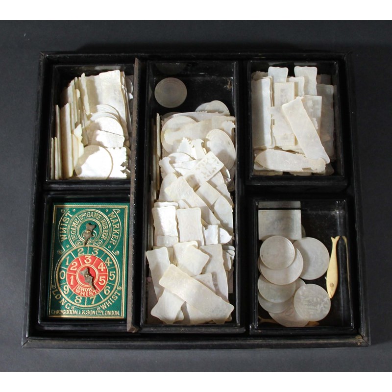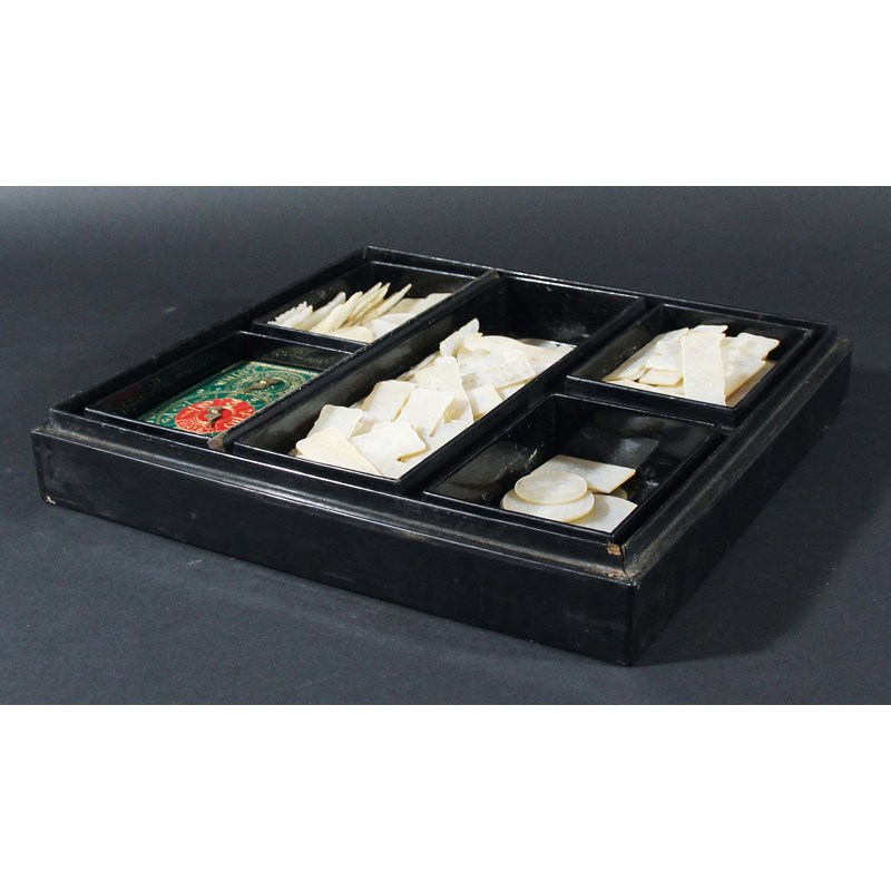CHINESE BLACK LACQUER GAMING BOX AND COVER, 19th century, enclosing five further boxes and covers (one missing) containing mother of pearl counters, approximately 200-250 counters, box 28cm x 25cm (parcel)