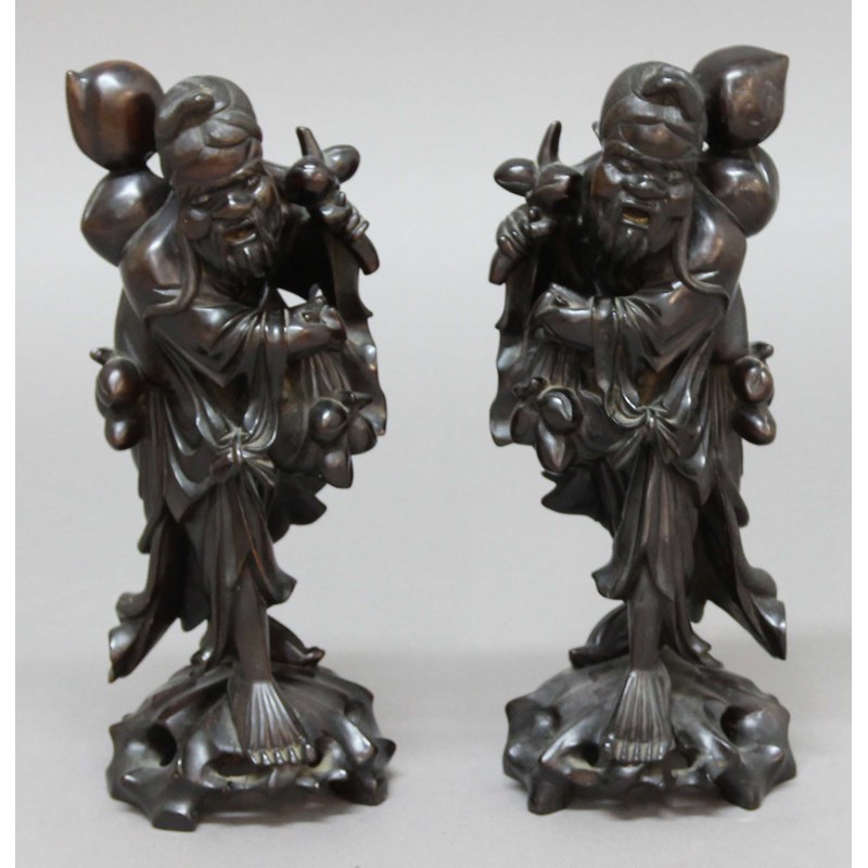 PAIR OF CHINESE ROOTWOOD CARVINGS, probably Shou Lao carrying branches of peaches, inset eyes and teeth, height 36cm (2)