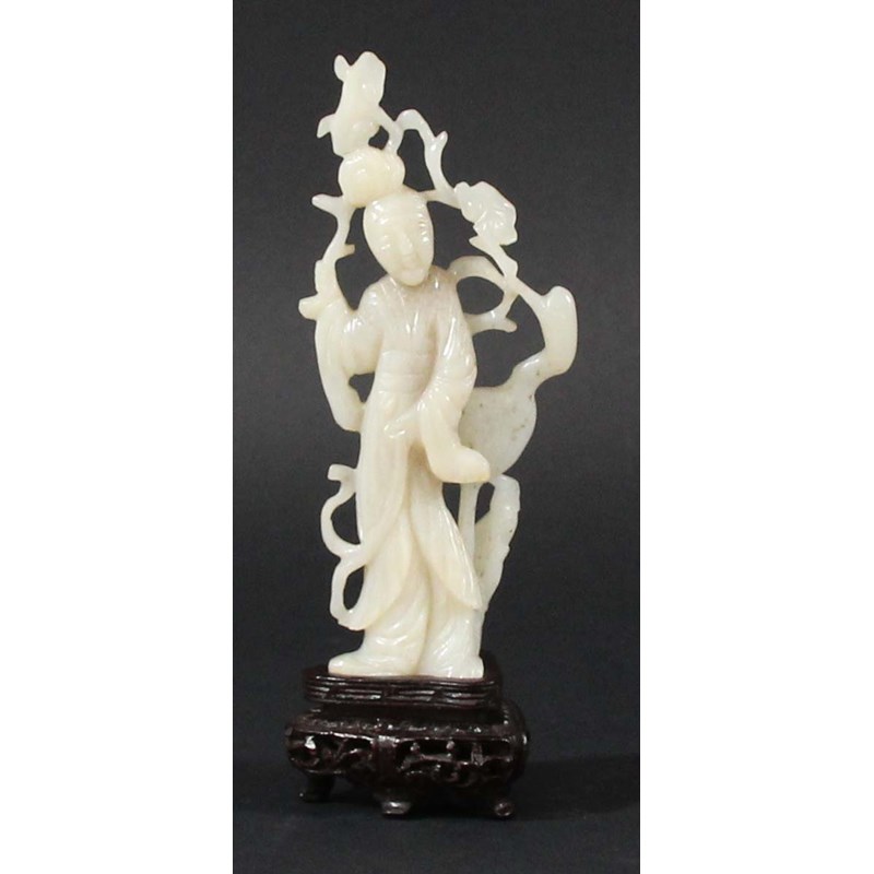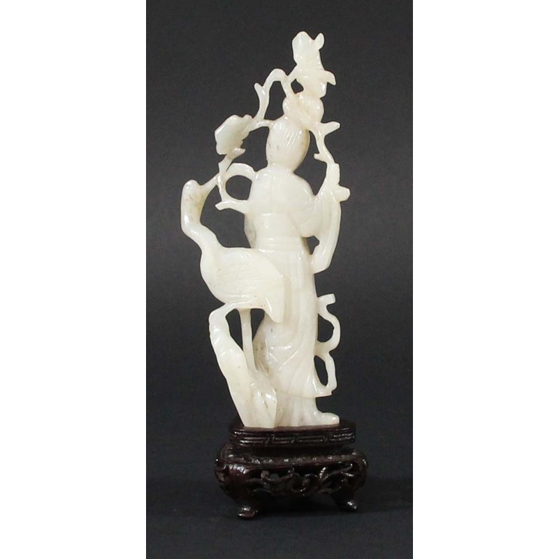 carved standing holding branches with a crane to her side, with stand, height excluding stand 13.5cm