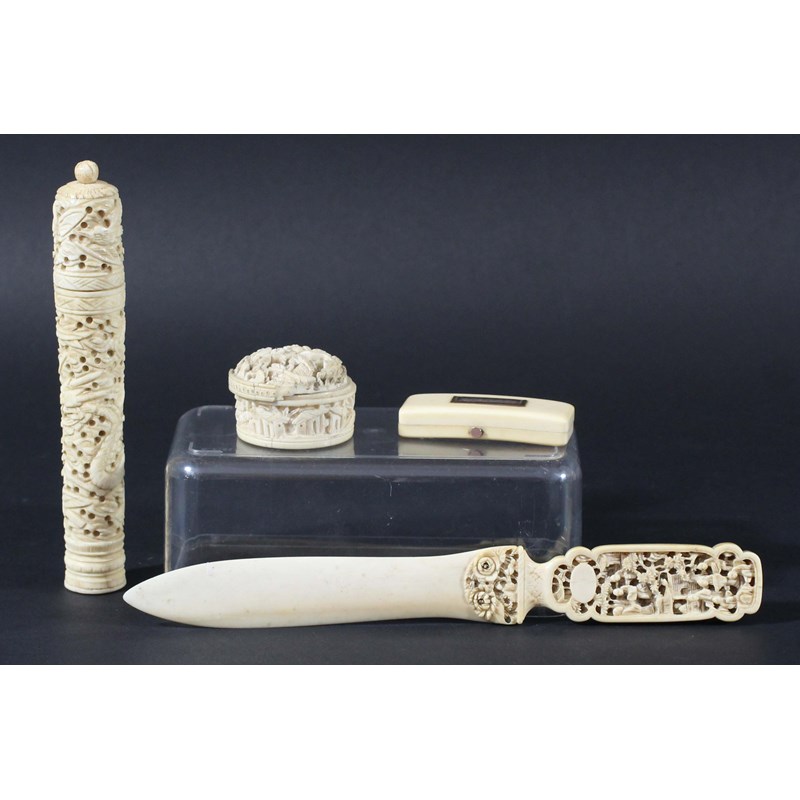 late 19th century, the handle carved with figures, buildings and trees, length 21.5cm; together with a bobbin case carved with dragons, a circular box and cover and a Georgian ivory snuff box (4)