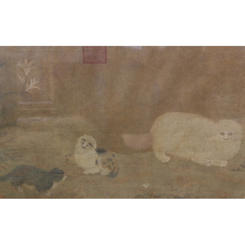Cat and two kittens, colours in silk, possibly late Ming, large red seal to top, collectors seal lower left, framed, 60cm x 97cm