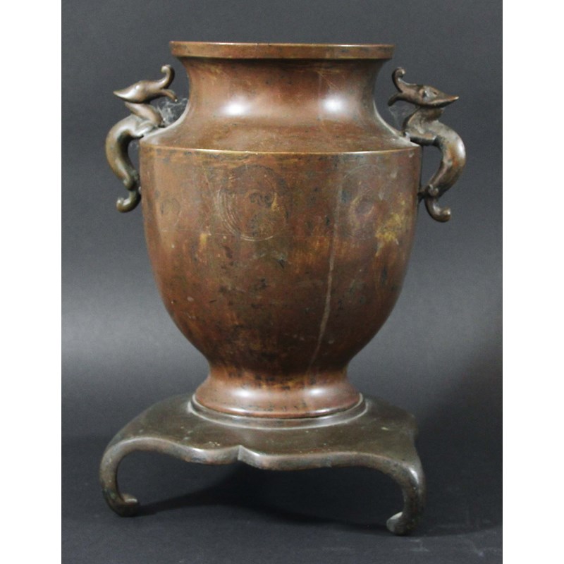 CHINESE BRONZE URN, Ming style, the body inlaid with white metal roundels of a phoenix and foliage beneath two stylised animal handles on a shaped tripod base, height 26cm