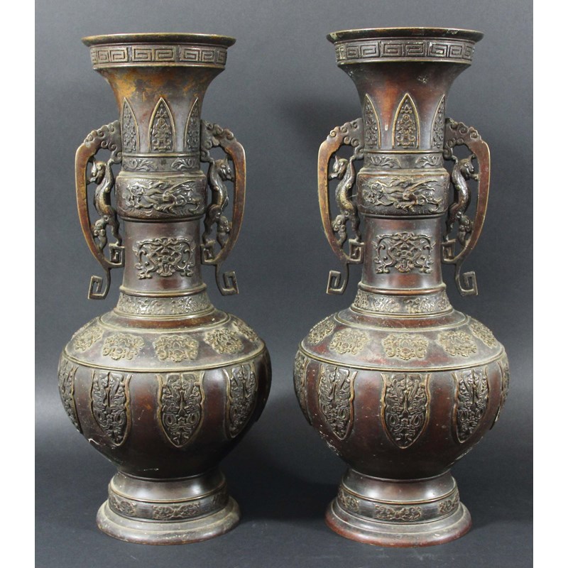 late 19th century, of two handled globe and shaft form, decorated with bands of decoration beneath a greek key rim, height 42.5cm (2)