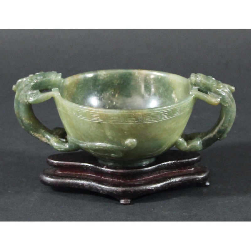 CHINESE MOTTLED GREEN JADE TWO HANDLED LIBATION CUP, the rounded bowl with two chilong handles with bifurcated tails, with stand, height excluding stand 5cm, width 12cm (2)