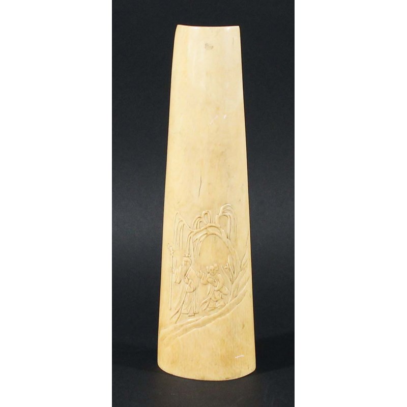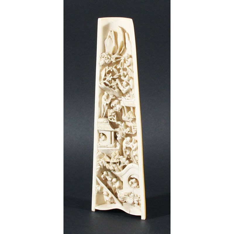 CHINESE IVORY WRIST REST, mid 19th century, carved in bas-relief with two figures beneath a tree, the reverse with numerous figures amongst buildings and trees, length 24cm