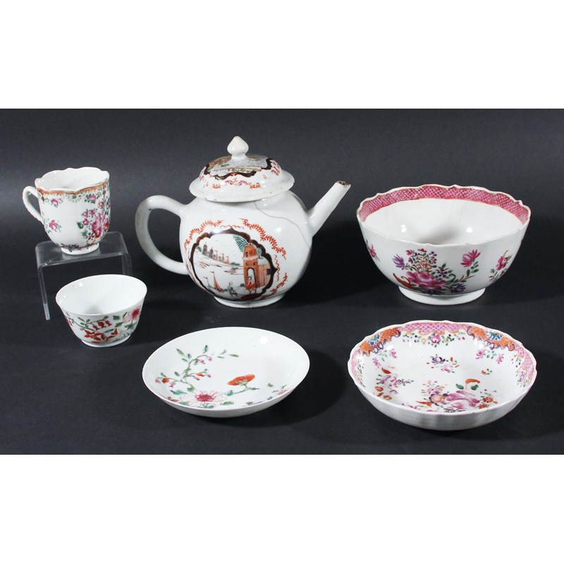 late 18th or 19th century, enamelled with a flower and fence design; together with a selection of 18th and 19th century export wares including a teapot and cover with Meissen style decoration, two slop bowls and two cups and saucers (16)