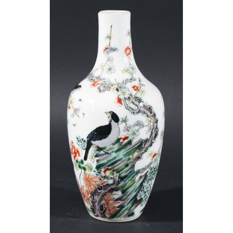 Kangxi marks but later, of bottle form, enamelled with birds amongst rock and flowering prunus, reduced, blue six character mark, height 21cm