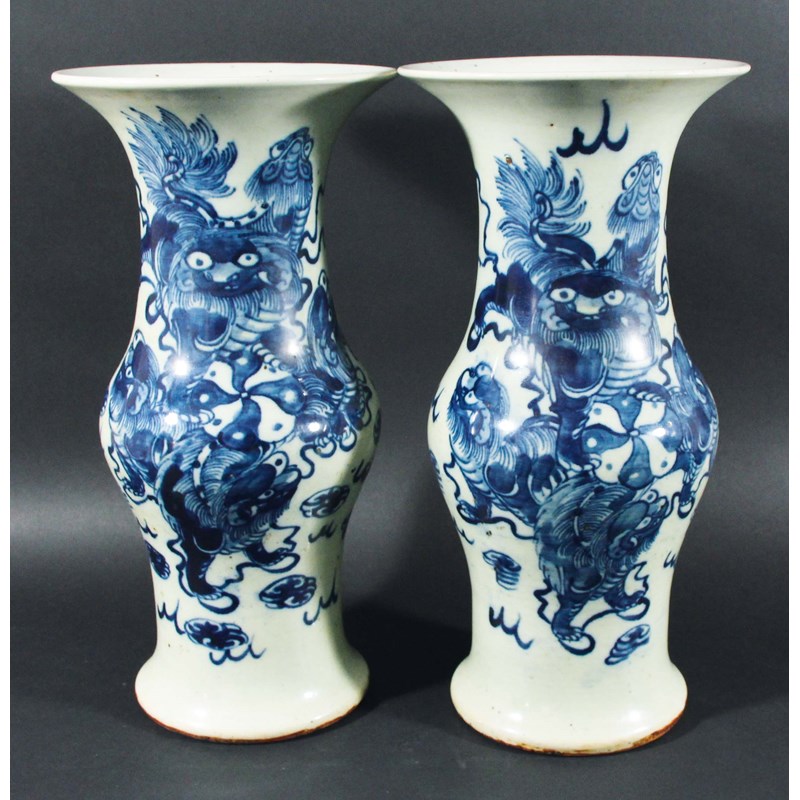PAIR OF CHINESE BALUSTER VASES, 20th century, blue painted with lions on a celadon ground, four character Chenghua style marks, height 39cm (2)