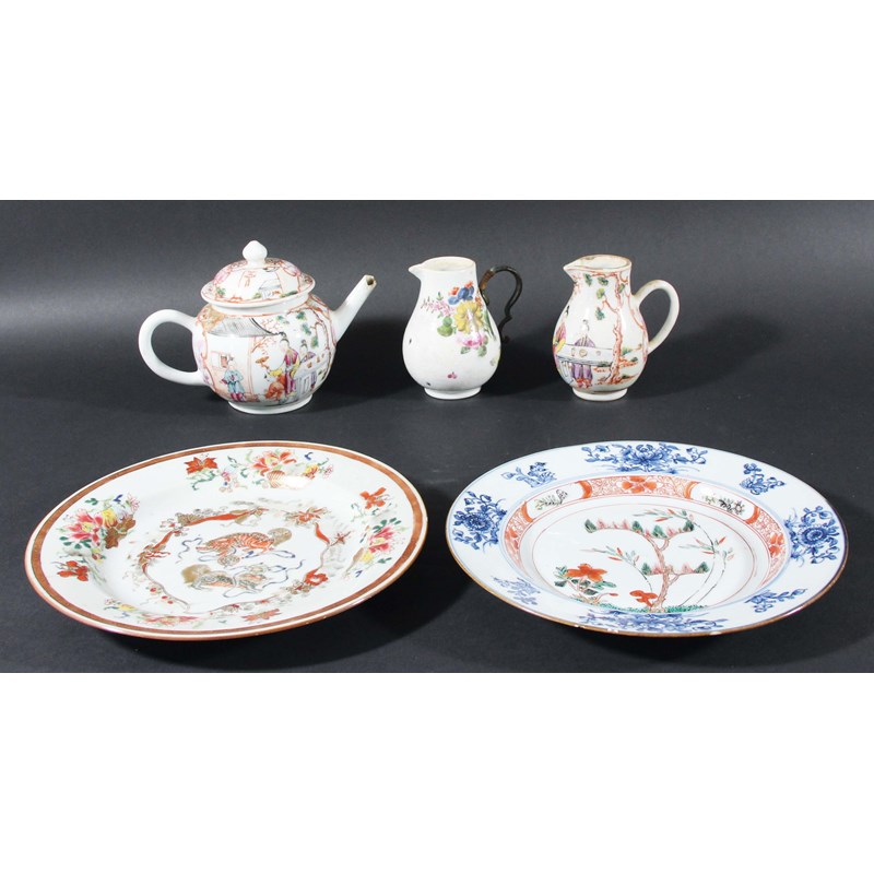 Qianlong, painted with genre scenes of figures in a garden, height 13cm; together with a matching sparrow beak jug, another bianco sopra bianco florally painted sparrow beak jug and two plates (6)