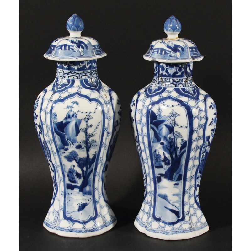 PAIR OF CHINESE BLUE AND WHITE VASES AND COVERS, 19th century, of ribbed, flattened oval form, painted with cartouches of landscapes and vases, the cover with flowerbud finial, painted mark to base, height 31cm (4)