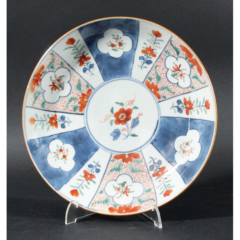 CHINESE IMARI SAUCER DISH, with radiating panels around a central flower head, diameter 22cm