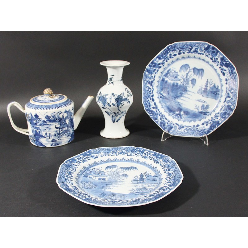 painted with a floral spray, height 18cm; together with a pair of export blue and white plates with pagoda scenes and a blue and white teapot and cover (5)