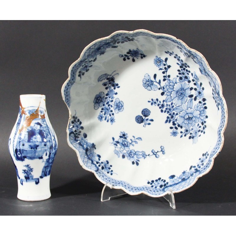 Kangxi style but later, of swollen, melon moulded form, painted with a musician before two figures, blue four character mark, height 15cm; together with a blue and white foliate moulded bowl, probably 18th century, painted with floral sprays beneath a wavy rim, diameter 23cm (2)