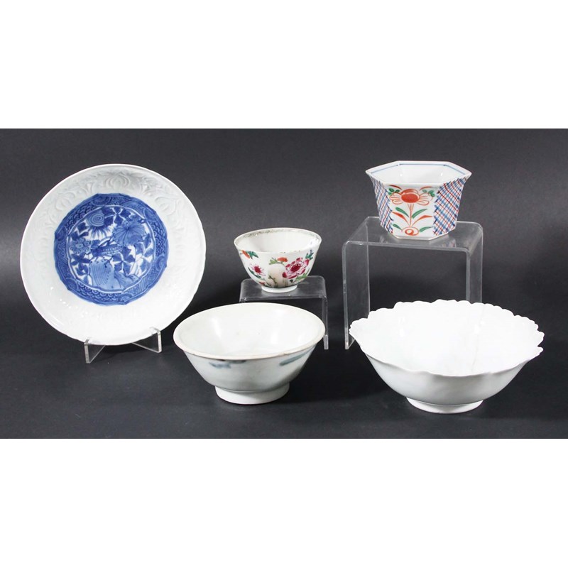 to include Chinese and Japanese, comprising a famille rose tea bowl, blue and white foliate form saucer dish blue painted with a cricket inside a moulded foliate border, a leaf moulded dish, a 'cargo' style dish and a hexagonal pot (5)