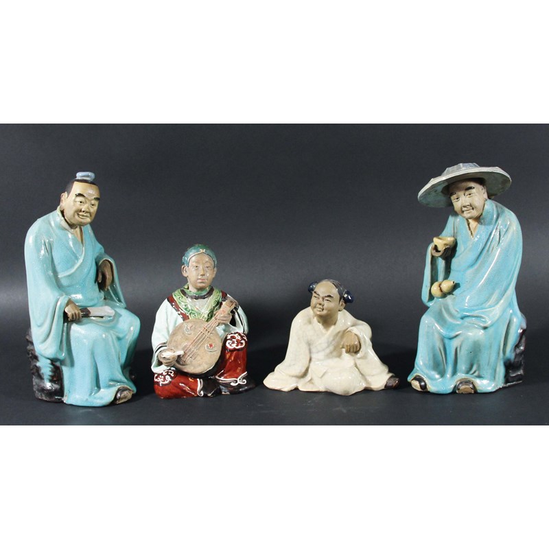 seated, wearing turquoise robes, with matt faces and hands, 23cm; together with another, similar, of a young boy in a cream outfit and a fourth of a nodding figure (4)
