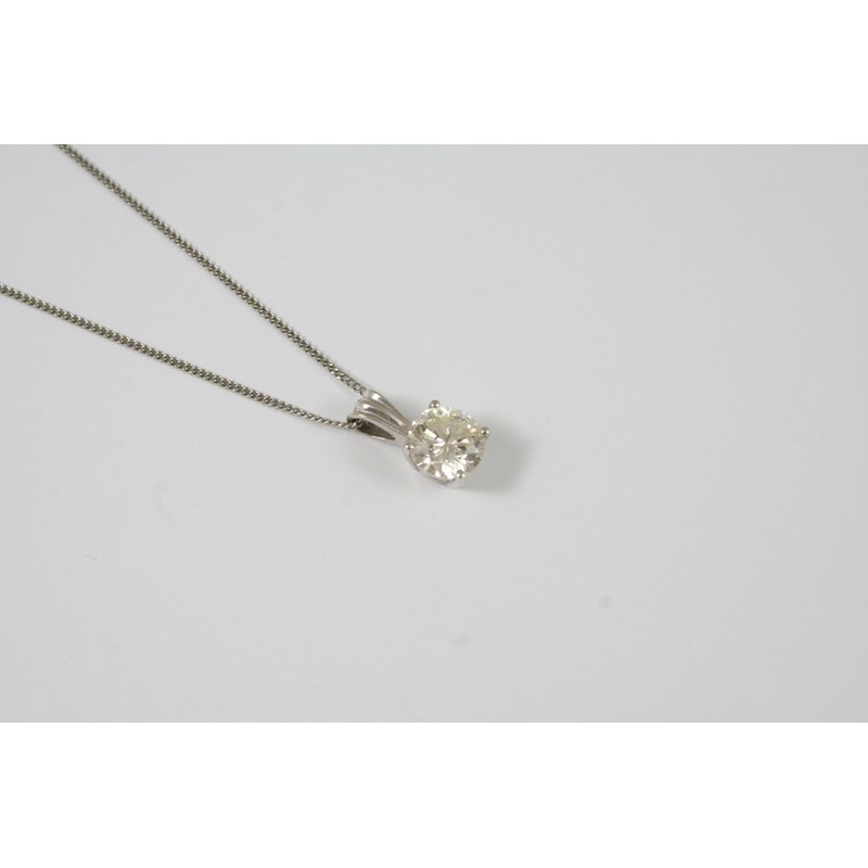 A DIAMOND SOLITAIRE PENDANT the round brilliant-cut diamonds weighs approximately 1.55 carats and is set in 18ct. white gold.