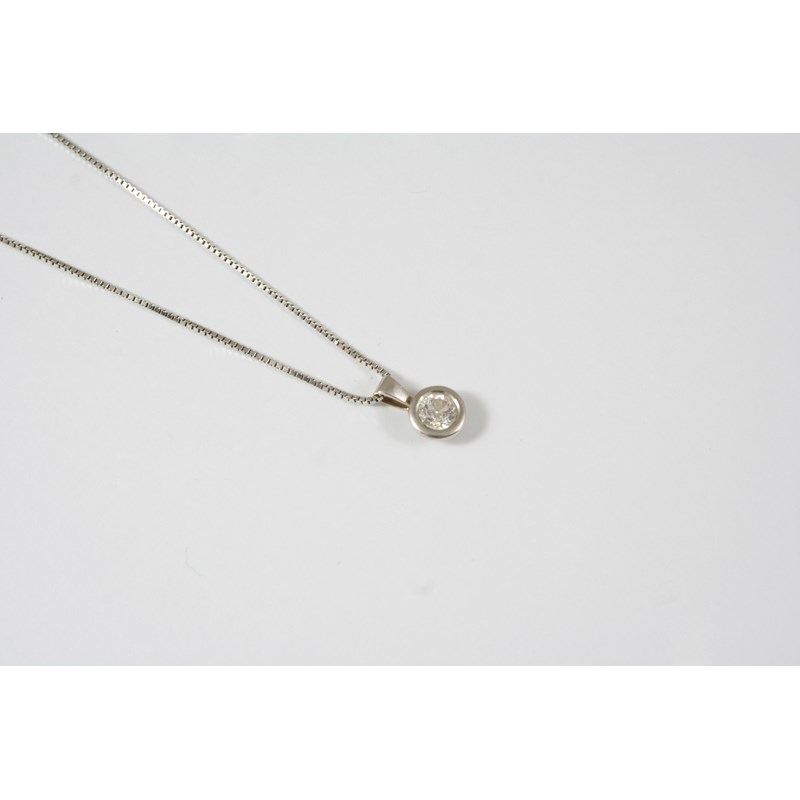 the brilliant-cut diamond weighs 0.76 carats and is mounted in an 18ct. white gold collet setting, on an 18ct. gold fine link neckchain.