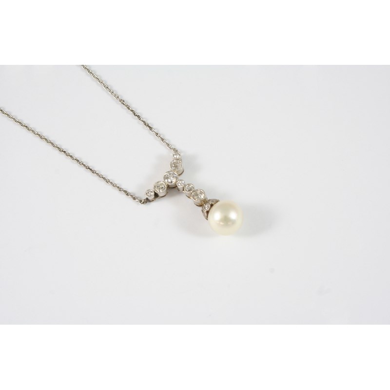 formed with graduated circular-cut diamonds suspending a cultured pearl measuring approximately 9.6mm., on a fine link chain.