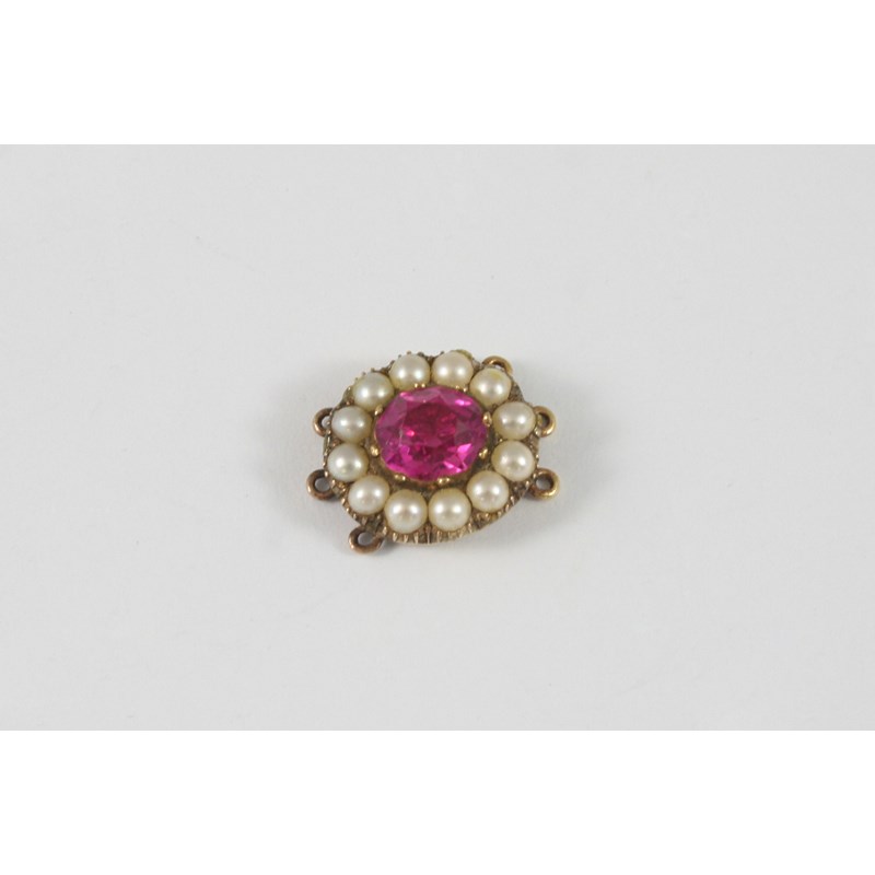 the oval-shaped foil backed pink sapphire is set within a surround of small untested pearls, in gold, 2cm. wide.