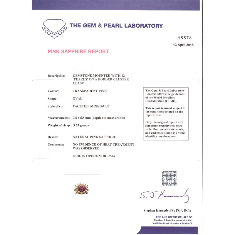 Accompanied by report number 15576 from The Gem & Pearl Laboratory dated 13th April 2018 stating that the oval, faceted, mixed-cut pink sapphire is a natural sapphire and that no evidence of heat treatment was observed. Origin opinion: Burma.