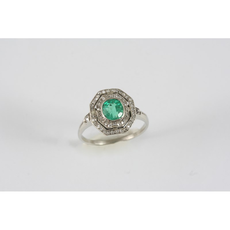 AN ART DECO EMERALD AND DIAMOND CLUSTER RING the oval-shaped emerald is set within a double surround of small diamonds. Size M 1/2.
