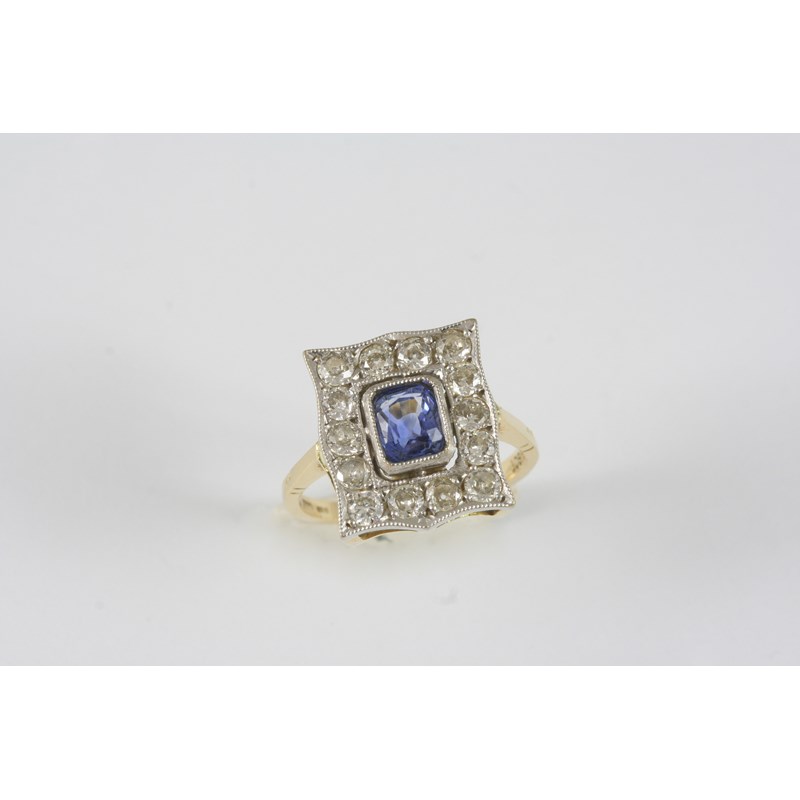 the rounded rectangular-shaped sapphire is set within a surround of fourteen circular-cut diamonds, in 18ct. gold. Size N 1/2.