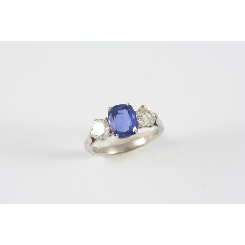 A SAPPHIRE AND DIAMOND THREE STONE RING