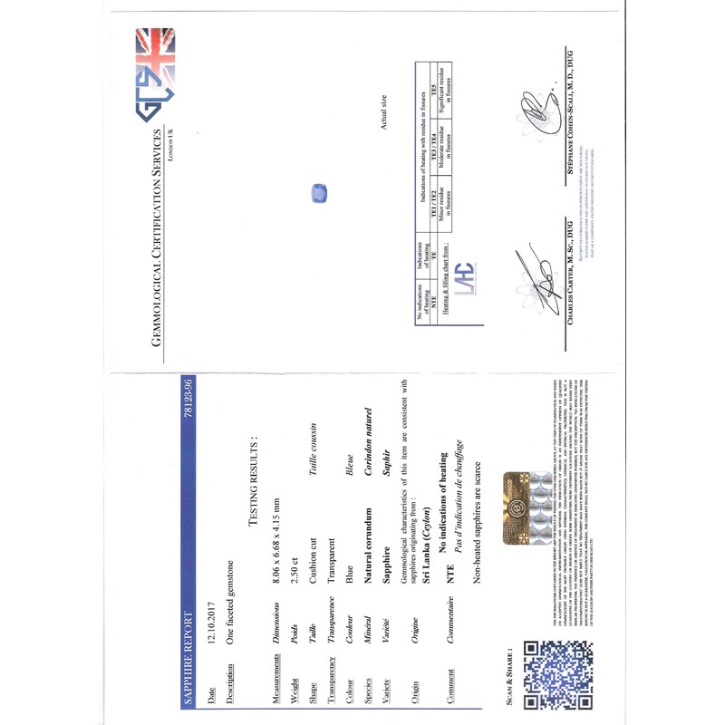 Accompanied by report number 78123-96 from GCS dated 12th October 2017 stating that the natural sapphire weighs 2.50 carats with no indications of heating. Origin: Sri Lanka (Ceylon).