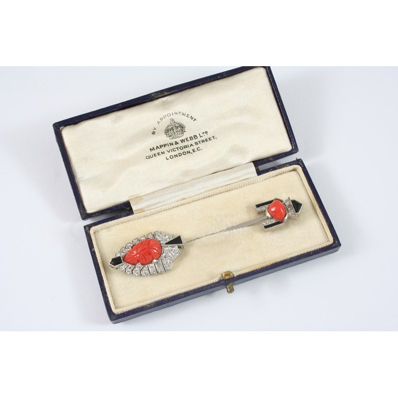 AN ART DECO CORAL, DIAMOND AND BLACK ONYX JABOT PIN