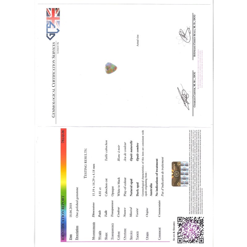 Accompanied by report number 78152-36 from GCS dated 18th April 2018 stating that the natural black opal measures 15.19 x 14.29 x 4.18mm., weighs 4.81 carats and shows no indications of treatment. Origin: Australia.