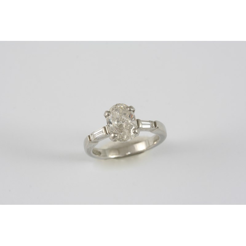 the oval brilliant-cut diamond is set with a baguette-cut diamond to each shoulder, in platinum. Size L.