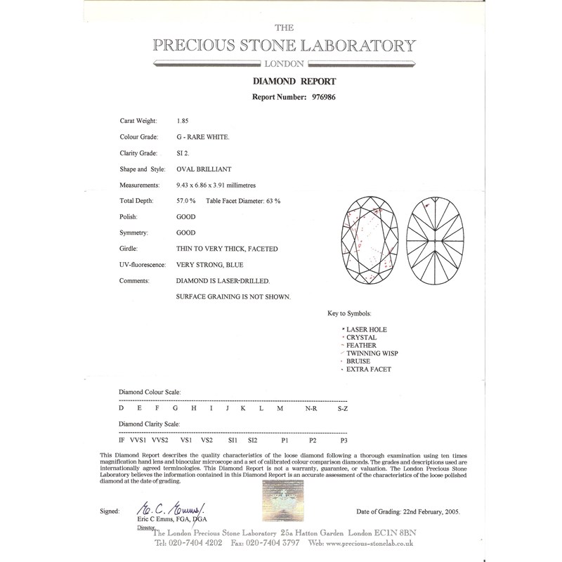 Accompanied by report number 976986 from The Precious Stone Laboratory, London, dated 22nd February 2005 stating that the oval brilliant cut diamond weighs 1.85 carats and that it has G colour with SI2 clarity.