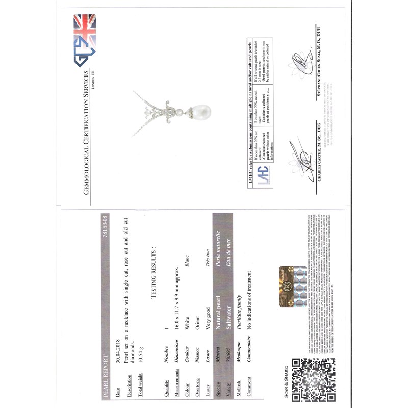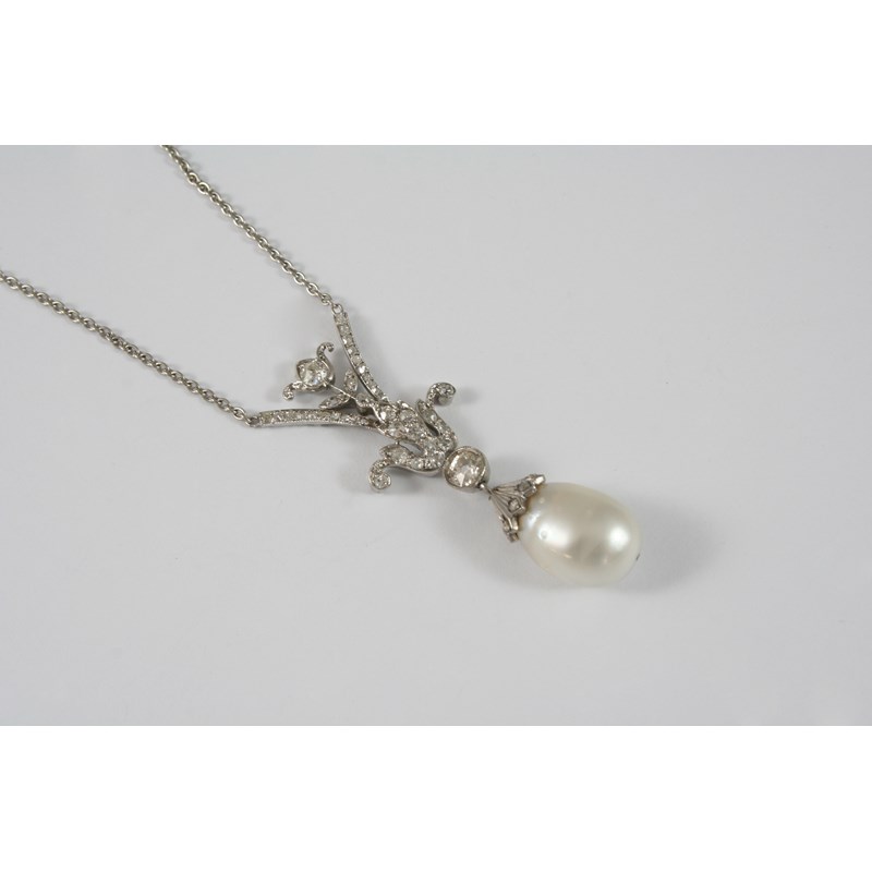 the foliate scrolling mount is set with graduated old brilliant-cut diamonds and rose-cut diamonds and suspends a natural pearl drop, on a fine link chain.