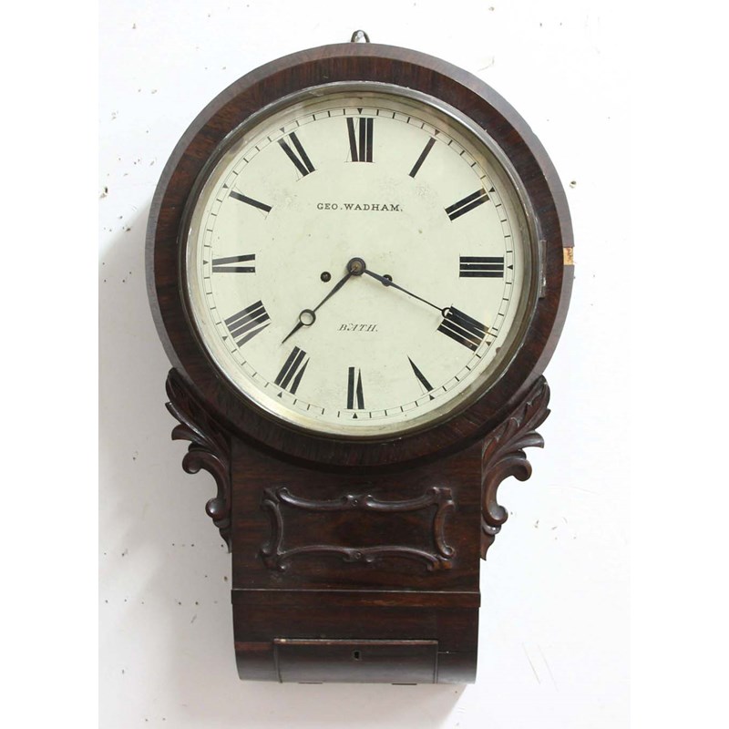 early 19th century, the 11 1/2" enamelled dial inscribed Geo. Wadham, Bath, on a brass, eight day, twin fusee movement, the case with a short trunk with scrolling cartouche, with pendulum and key, height 64cm