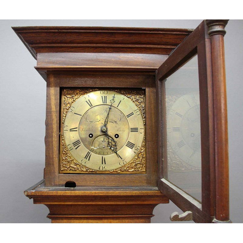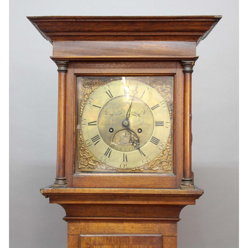 the 11" brass dial with date aperture and inscribed Samuel Pearce, Honiton on a brass, four pillar, eight day movement hourly striking to a bell, the crossbanded case with square glazed hood door flanked by columns, with weights, key and pendulum, height 208cm